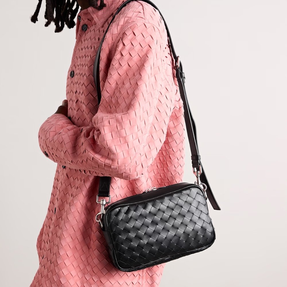 Cross-body bag in Intrecciato leather with detachable strap and metal D-ring.