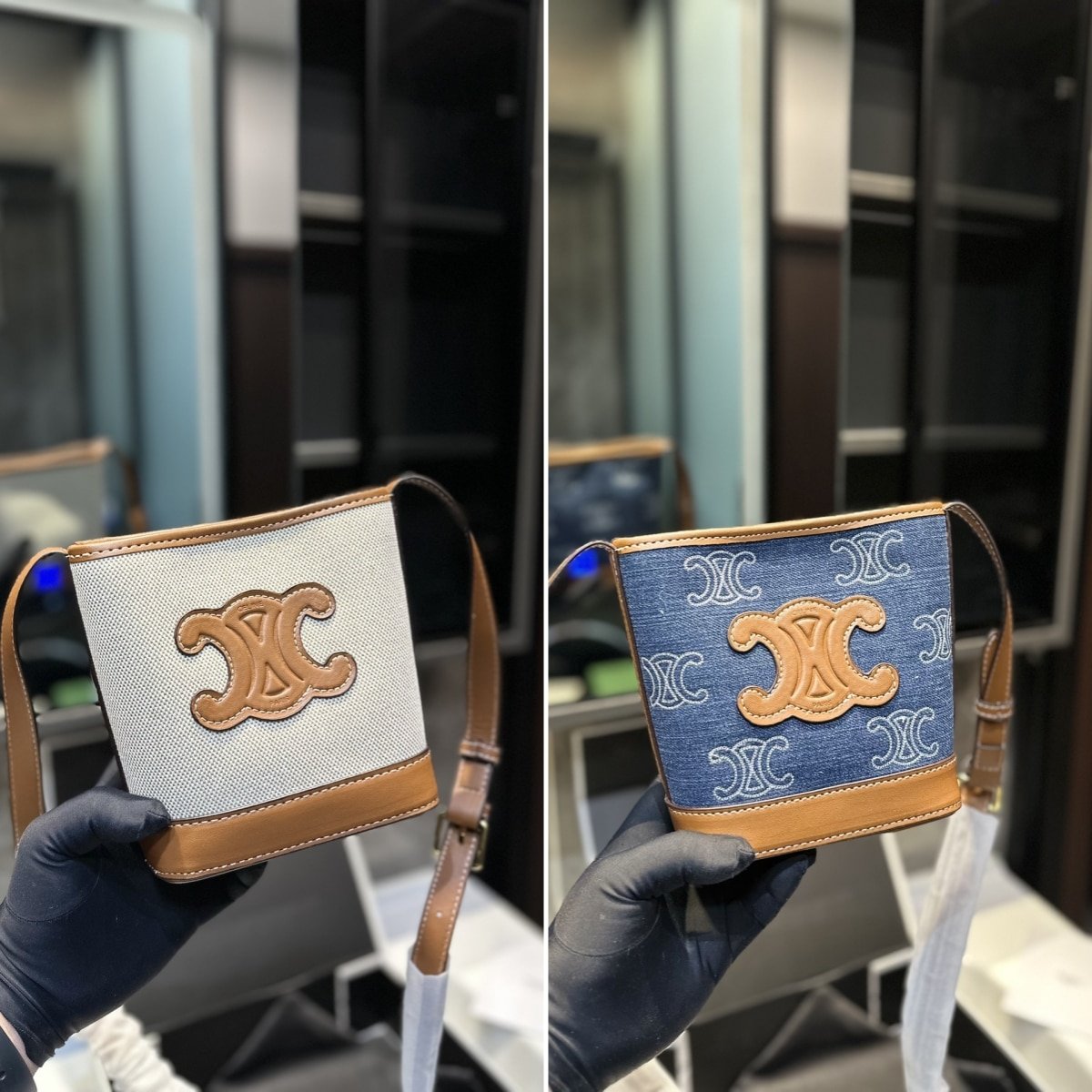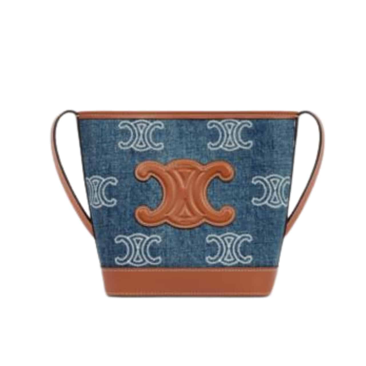 Celine Mini Bucket Cuir Triomphe In Denim With Triomphe All Over Embroidery And Calfskin Navy Tan 16Cm 10L432Fdx 07At