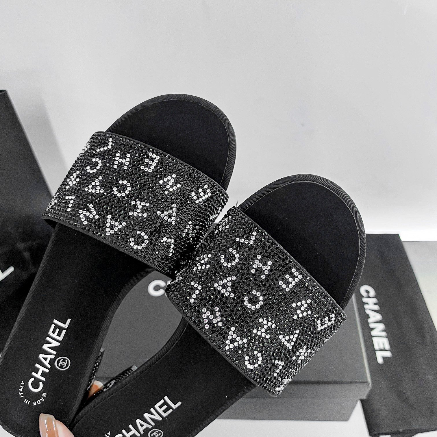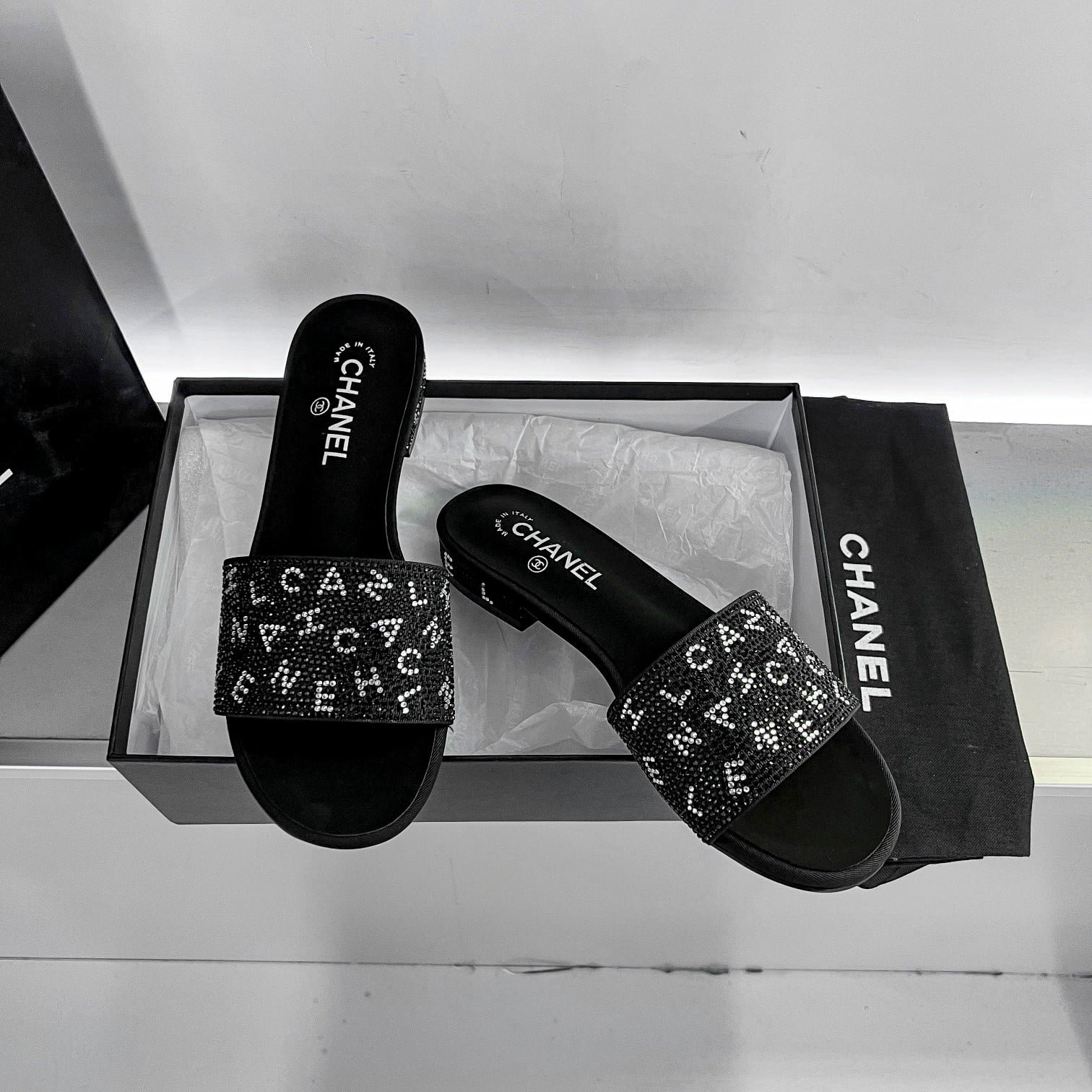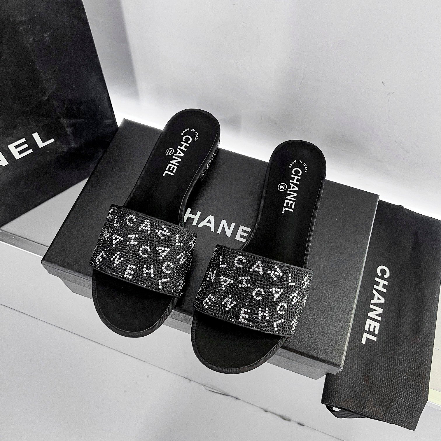 Be the first to review “Chanel 24P Beaded Diamond Logo Slippers Black” Cancel reply