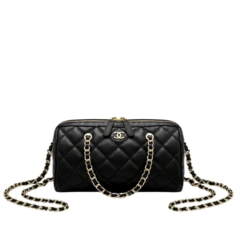 The Chanel Bowling Bag in black is a sophisticated and timeless accessory, featuring the brand’s signature quilted texture and gold-tone hardware. This versatile bag combines practicality with elegance, making it a perfect companion for any occasion. Its spacious interior and structured silhouette offer both style and functionality, while the gold chain strap adds a touch of luxury.