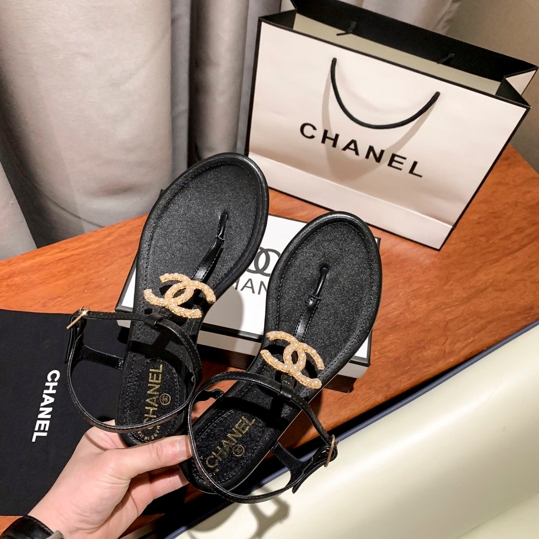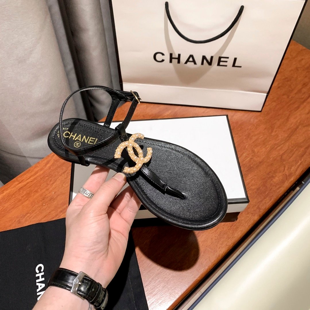 Chanel Gold Pearl Cc Logo Thong Sandals Black