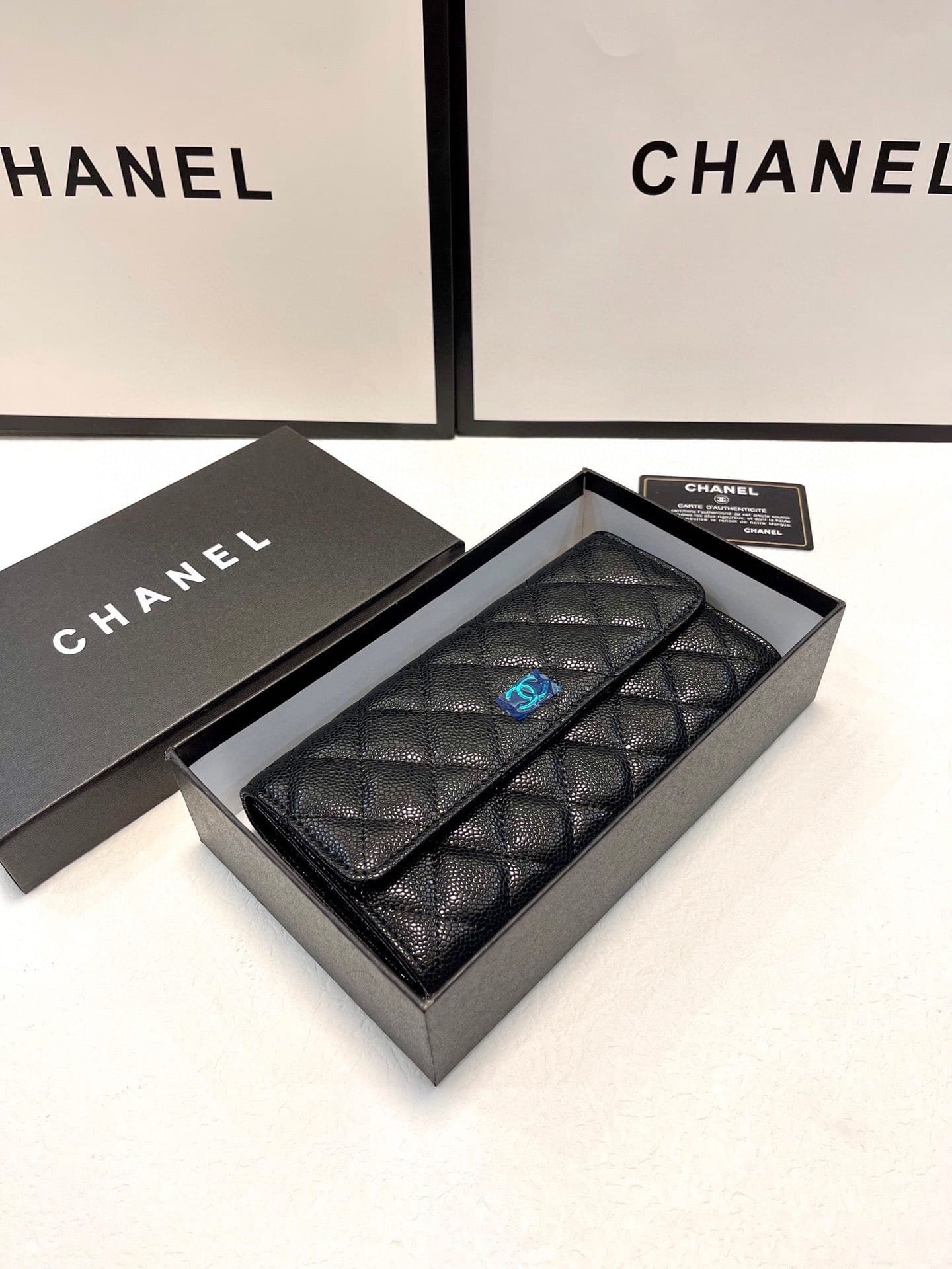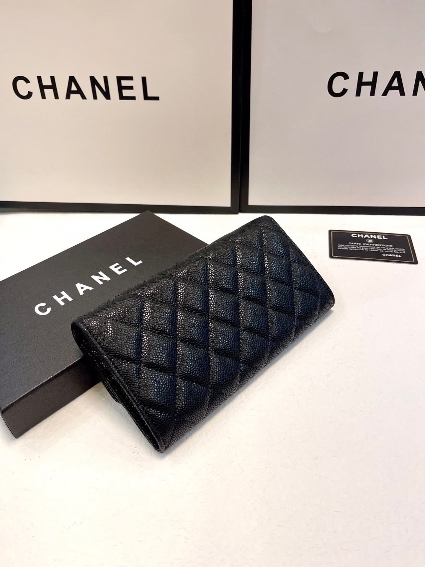 Chanel Long Flap Wallet Caviar Leather Black 19Cm