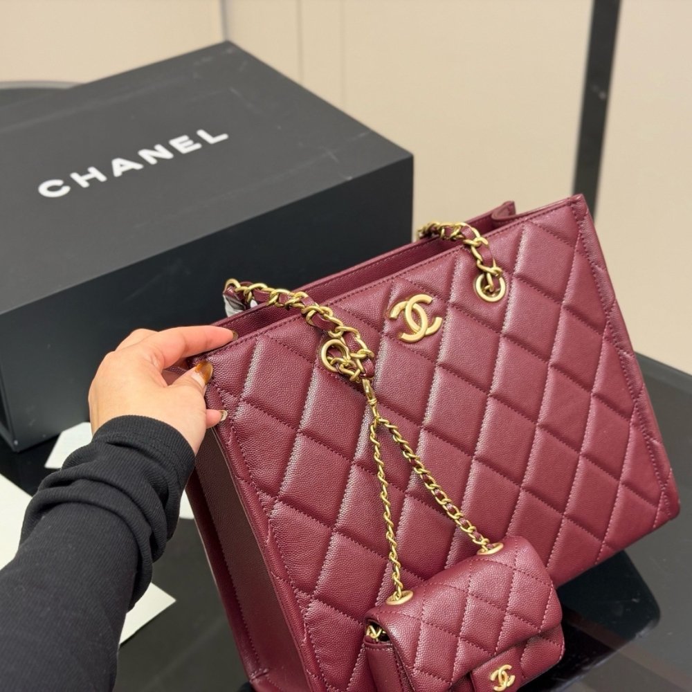 The Chanel Small Shopping Bag in Burgundy is an exquisite and practical tote that exemplifies the House’s dedication to blending daily utility with high-fashion elegance. This model is crafted from premium grained leather, offering a durable yet luxurious pebbled texture that is beautifully complemented by polished gold-tone metal hardware.