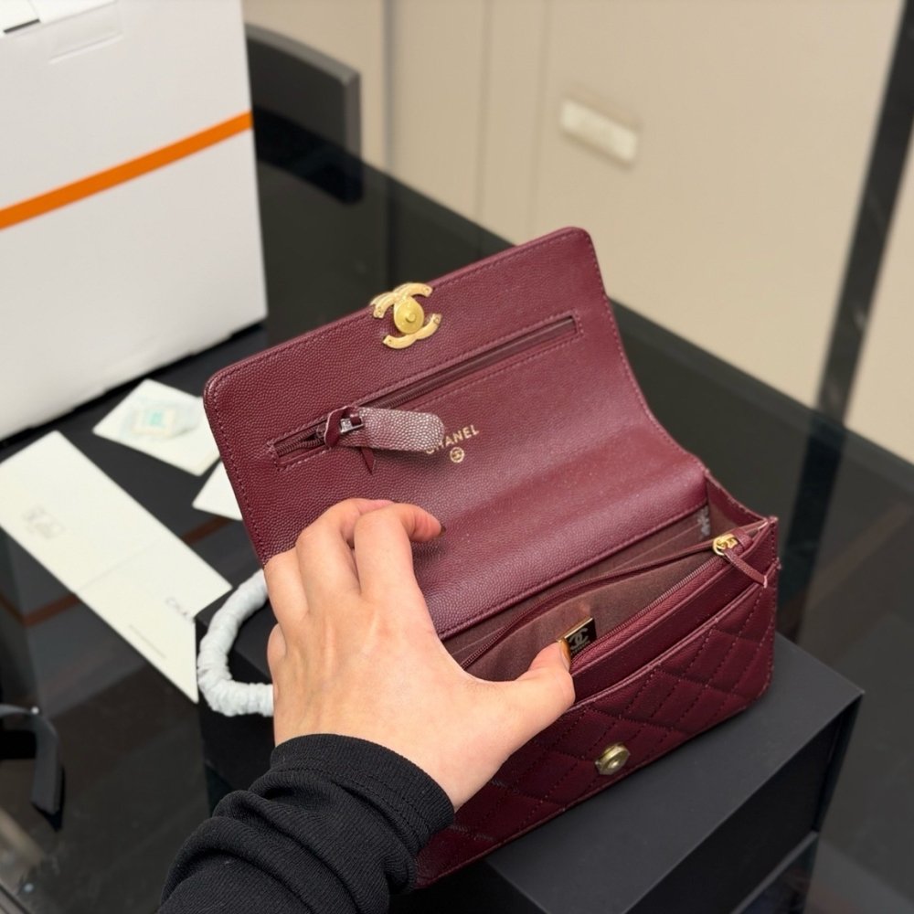 The Chanel Wallet On Chain (WOC) in Dark Burgundy is a quintessential luxury accessory that seamlessly bridges the gap between a high-end wallet and a classic evening bag. This specific model is distinguished by its deep, elegant burgundy hue, typically rendered in shiny grained leather, and is beautifully accented by polished gold-tone metal hardware.
