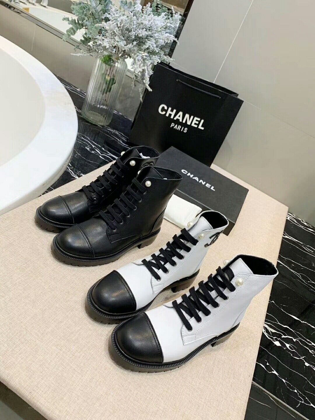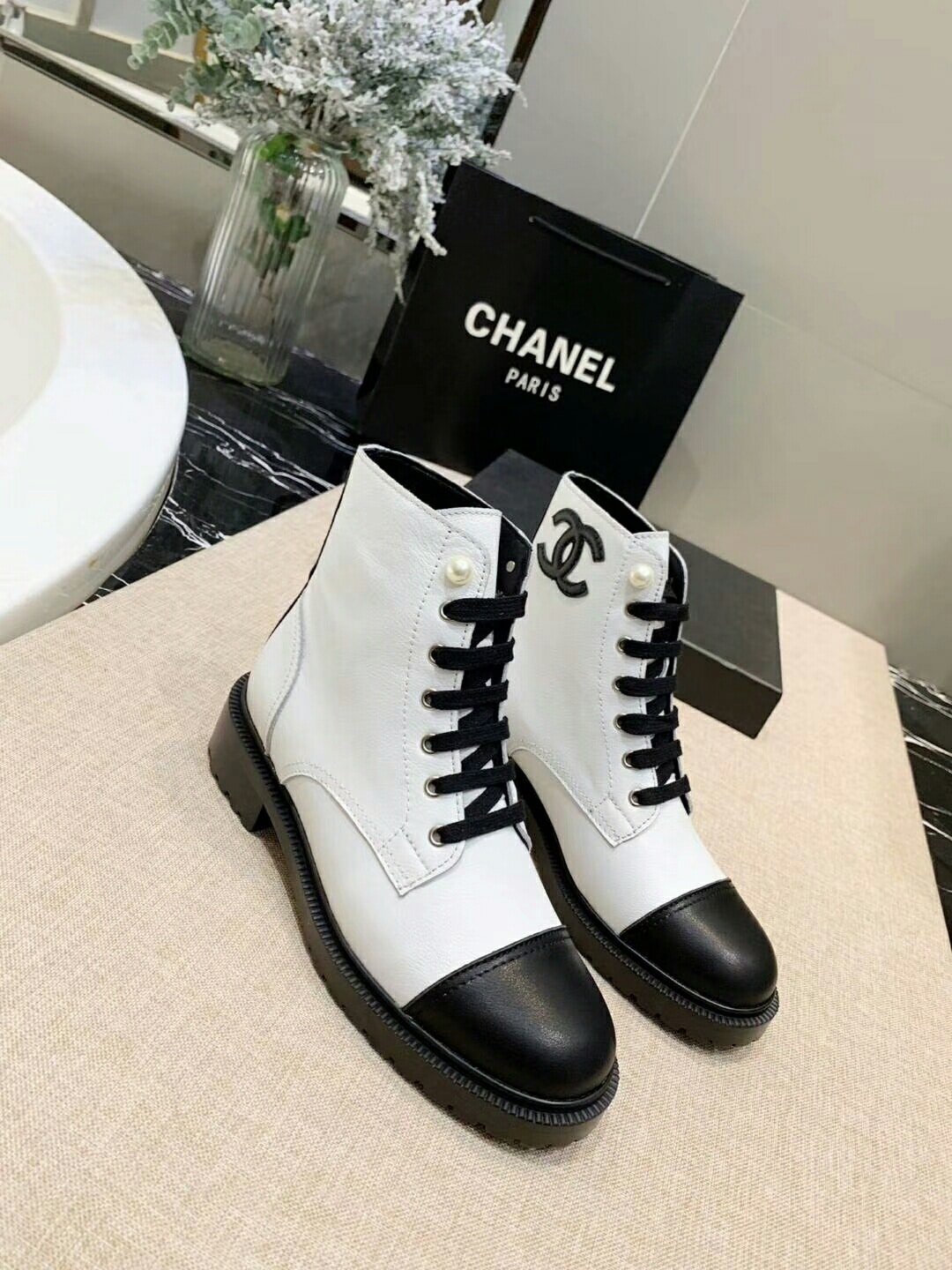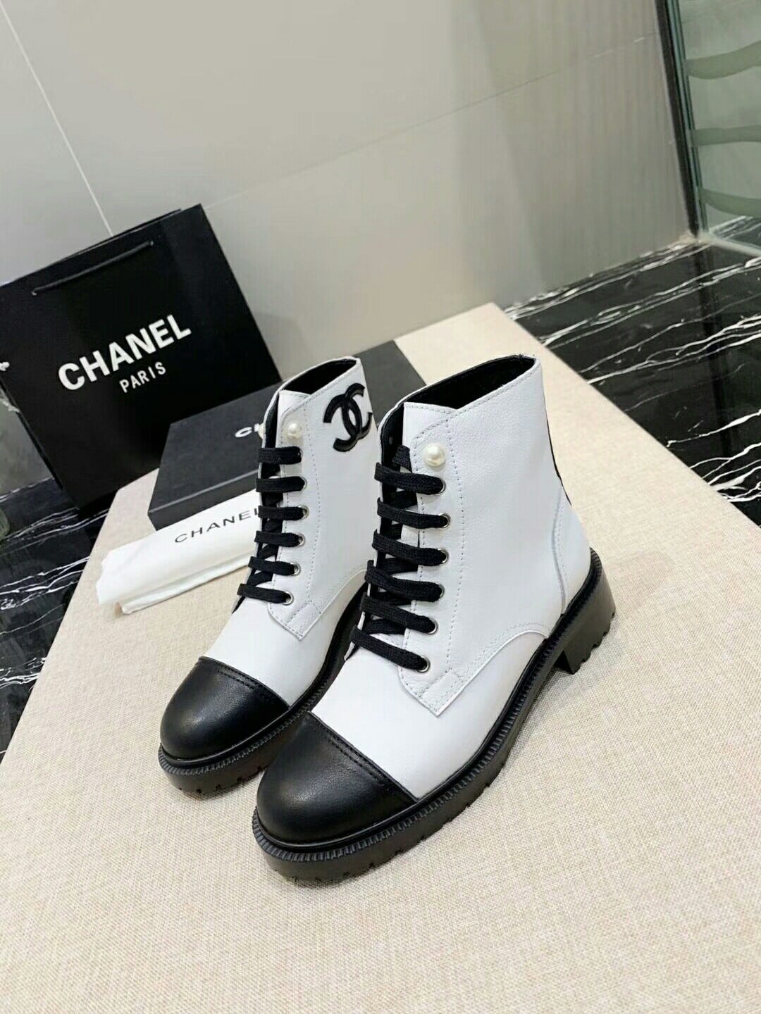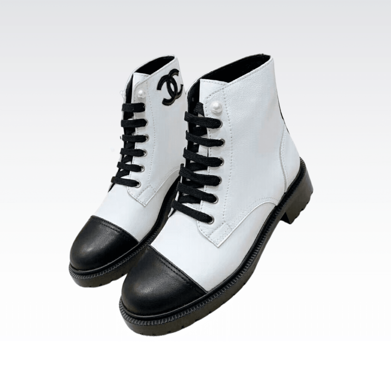 Be the first to review “Chanel White Pearl Logo Cc Combat Lace Up Tie Ankle Boots G36209” Cancel reply