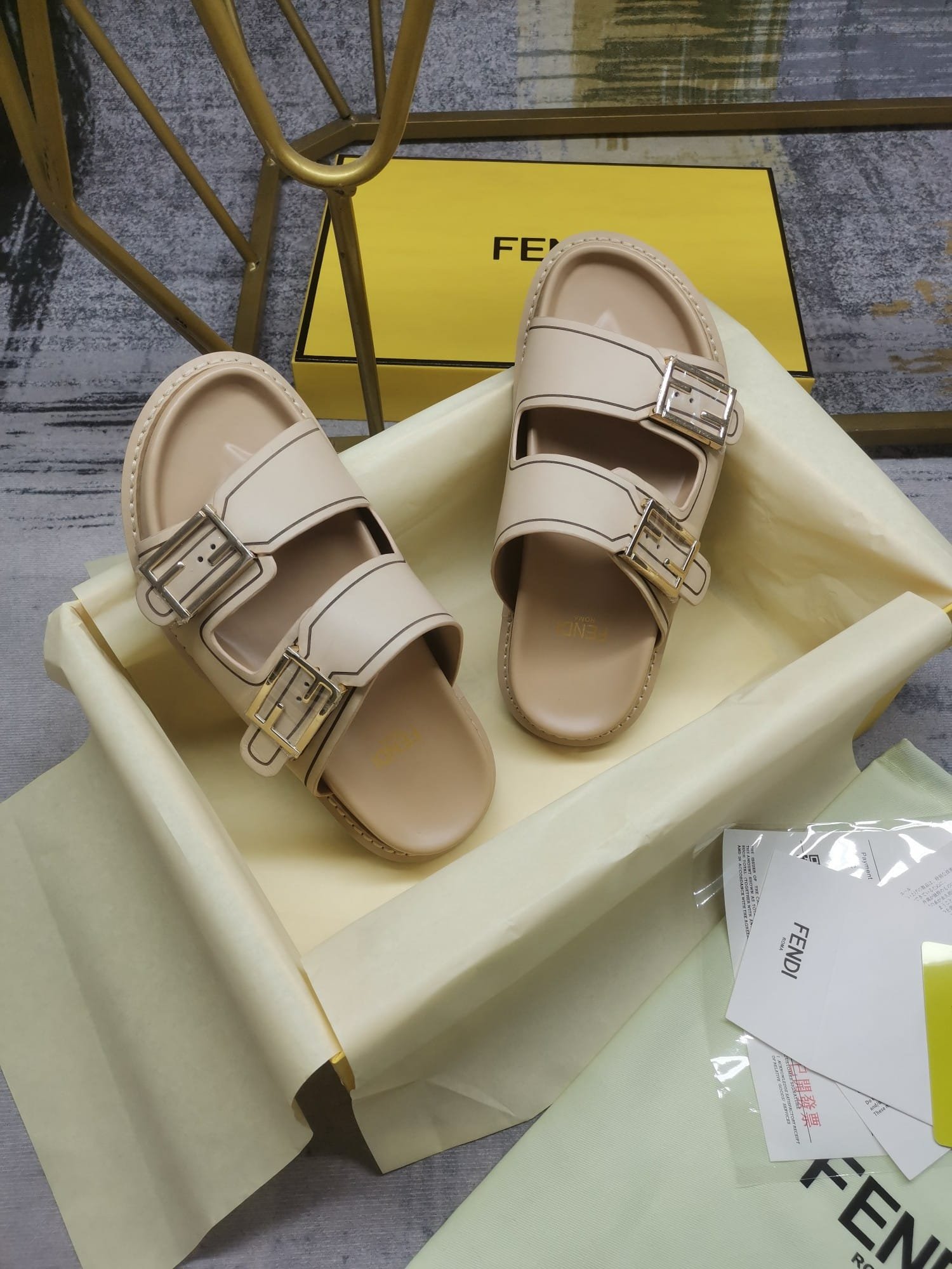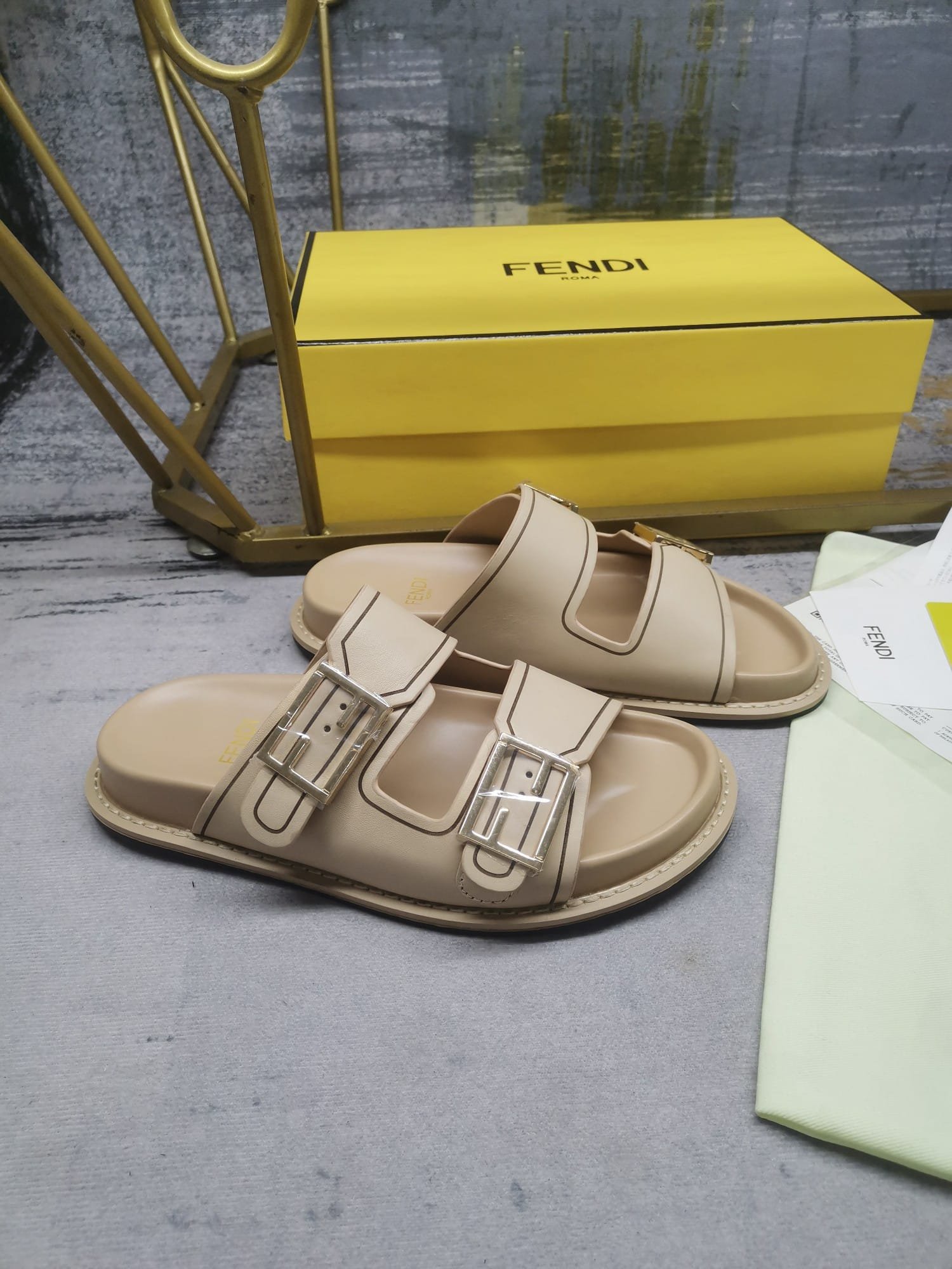 - Double-band flat slides with FF Baguette decorative buckles.