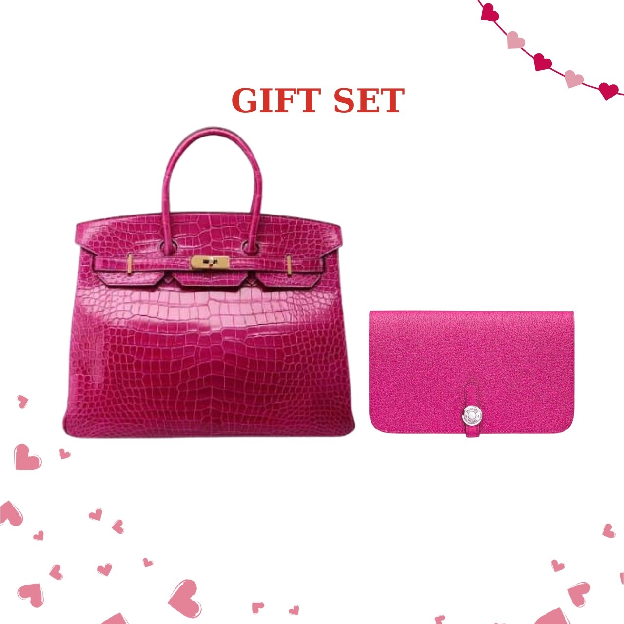 Gift Set: Hermes Birkin 25 Crocodile Gold-Toned Hardware Dark Pink With Dogon Duo Long Wallet Dark Pink 20Cm