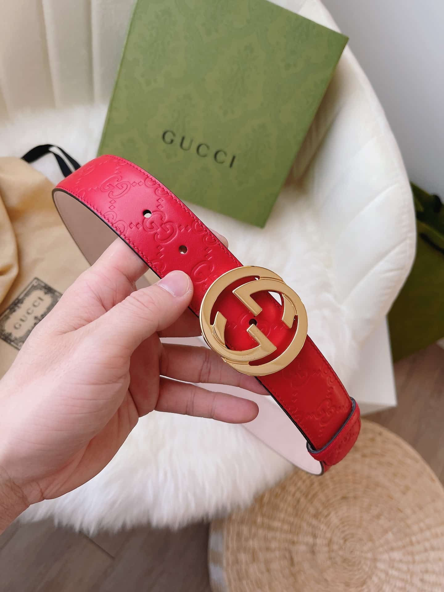 Gucci Calfskin Monogram Red Belt Gold Metal 3.5Cm