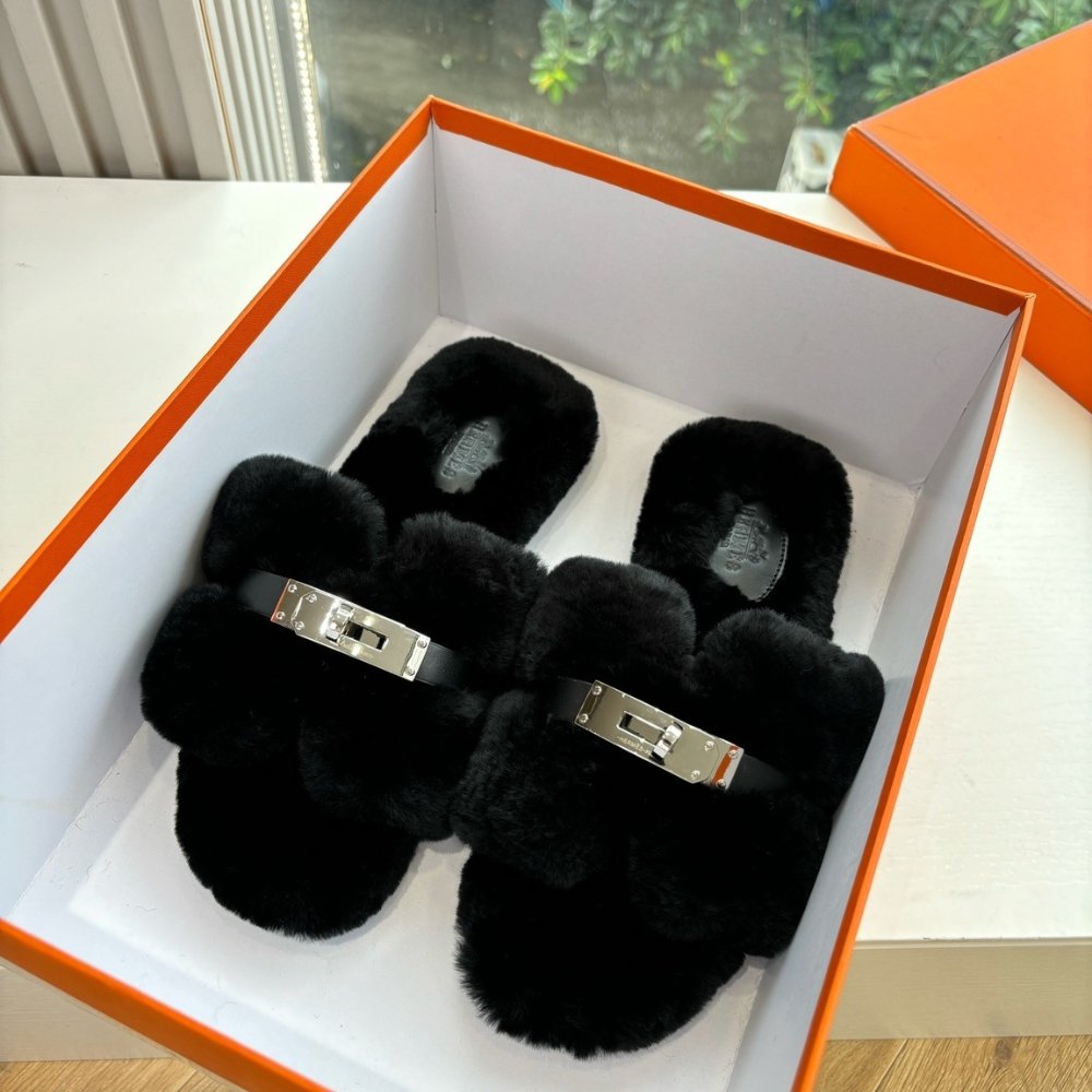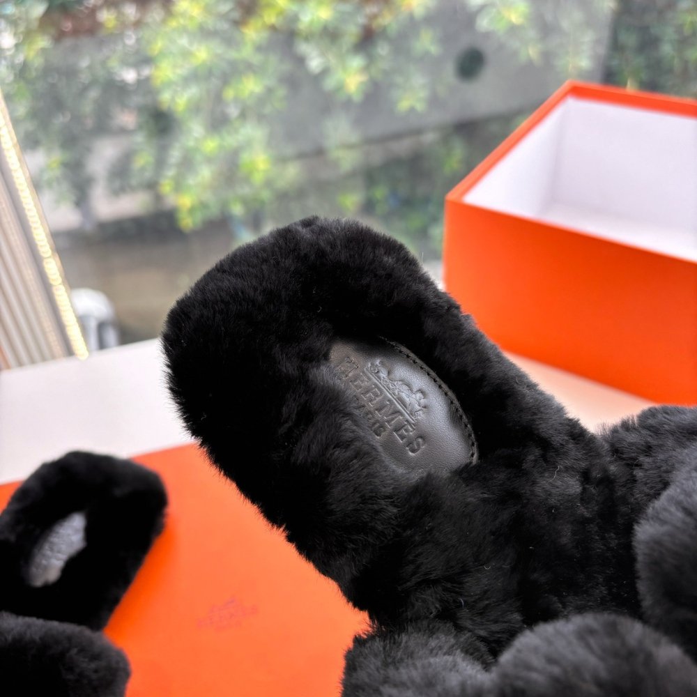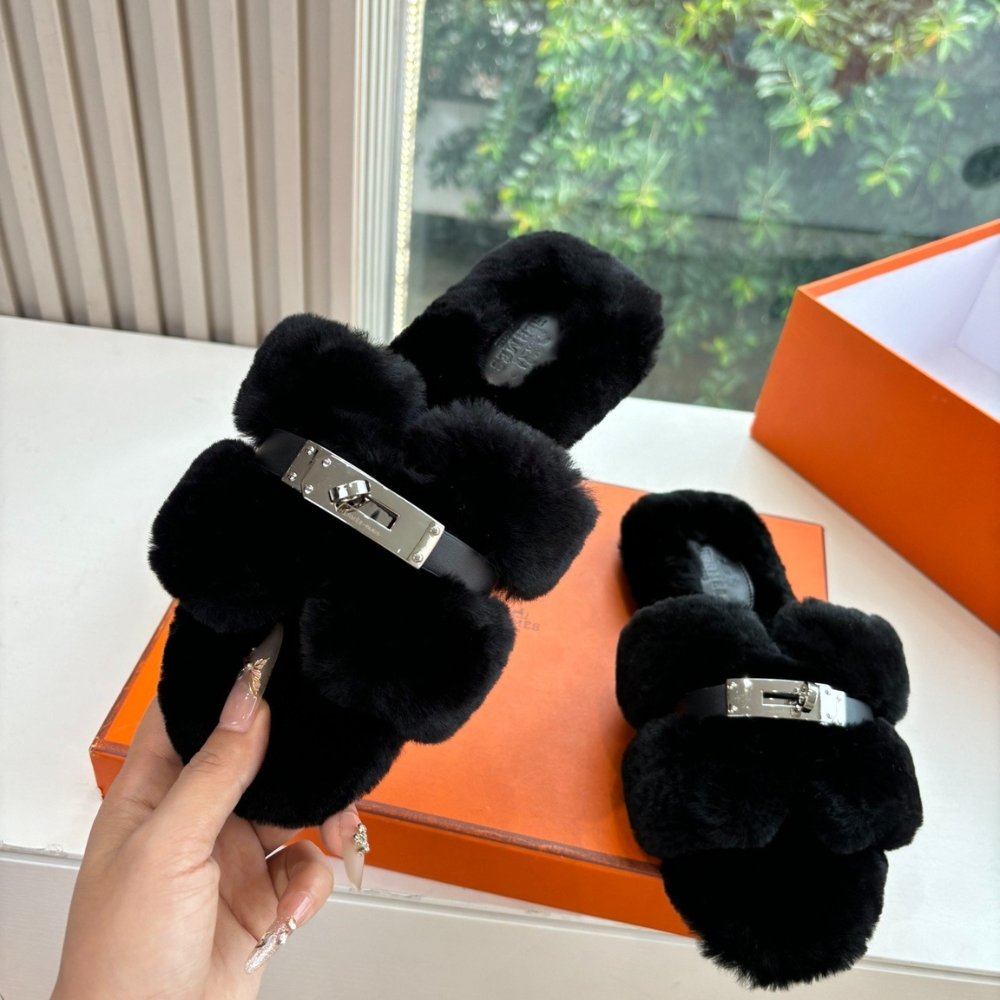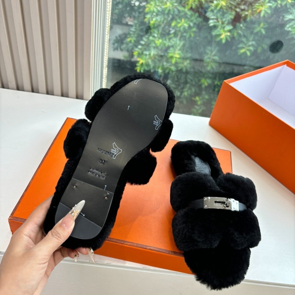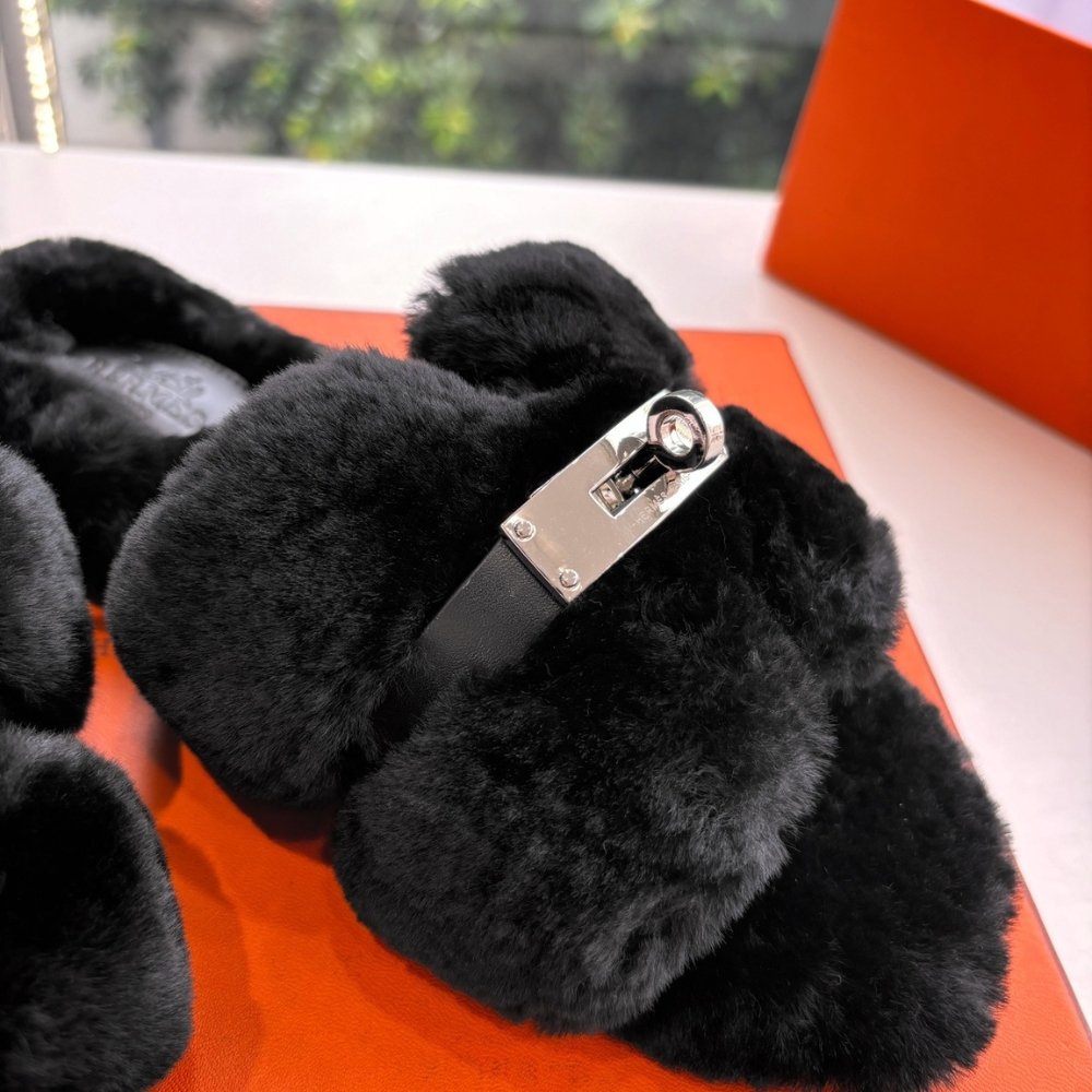 Hermes Shearling Fur Oran Silver Buckle Sandal Black
