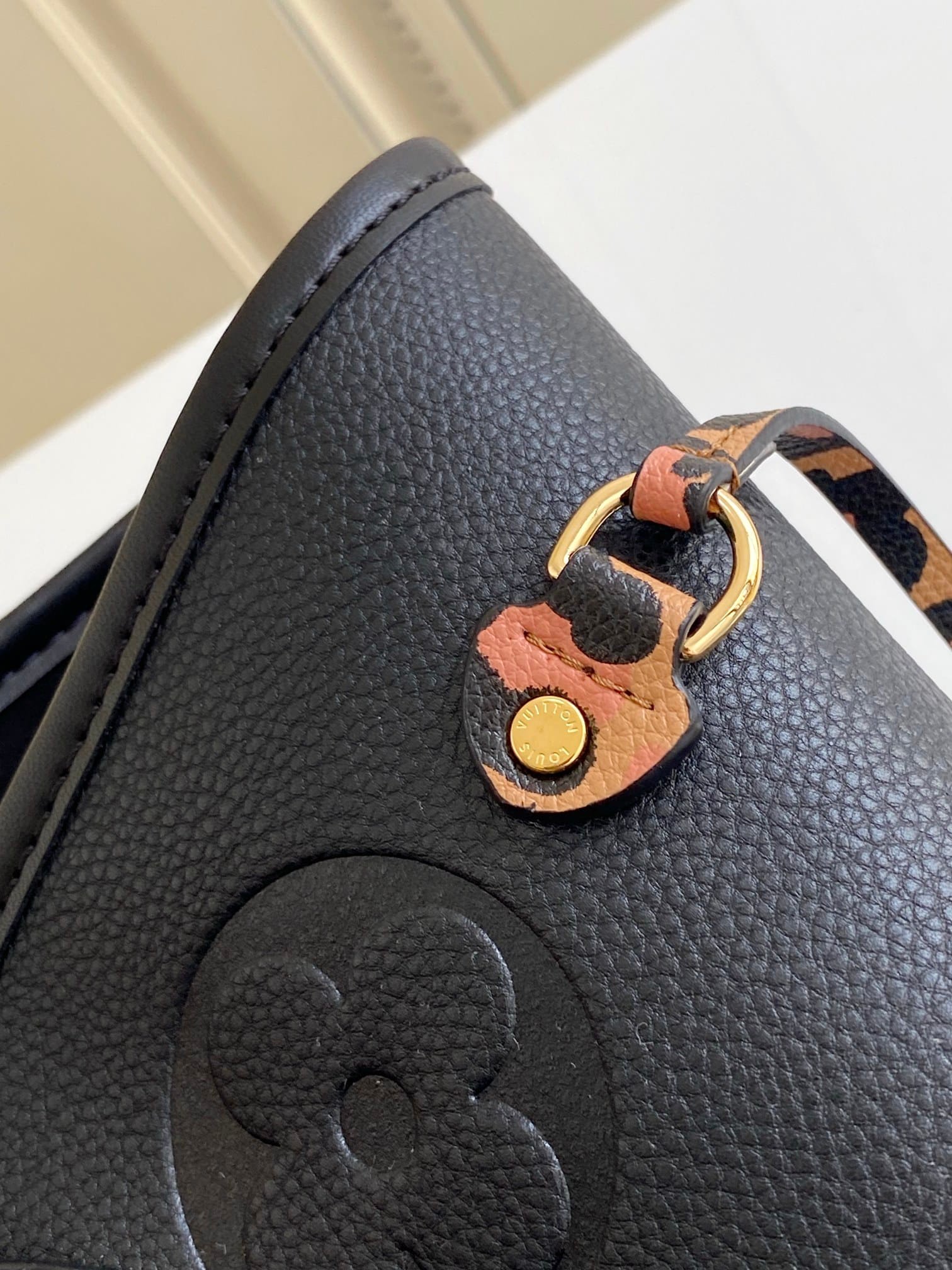 - Removable animal print leather ID tag