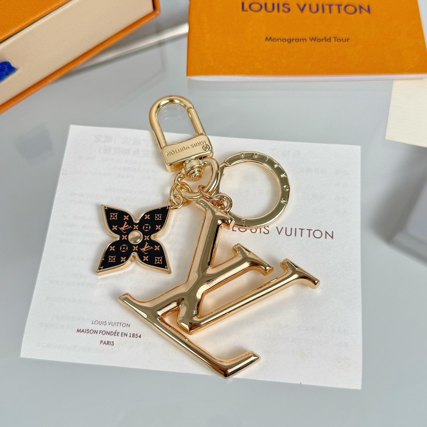 - LV Initials and a Monogram Flower charm