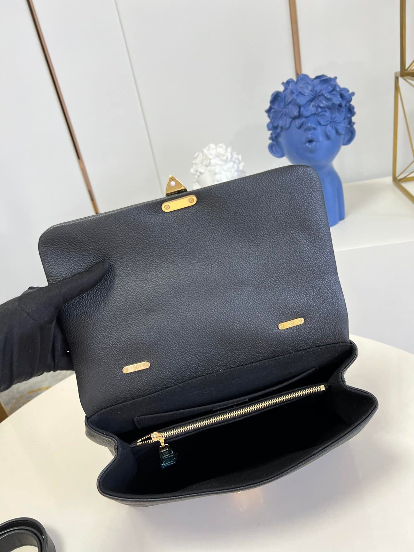 - Gold-color hardware