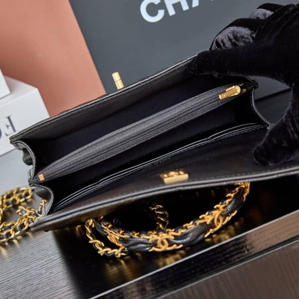 The Chanel Wallet on Chain (WOC) in black leather with gold-tone metal is a quintessential emblem of timeless luxury and compact versatility. This sophisticated is typically crafted from durable grained, featuring the iconic quilting and a signature gold-tone CC turn-lock or press-stud closure. Its highly organized interior includes multiple card slots, zipped compartments, while the long interlaced chain-and-leather strap allows for seamless transition from a chic clutch to an effortless crossbody.