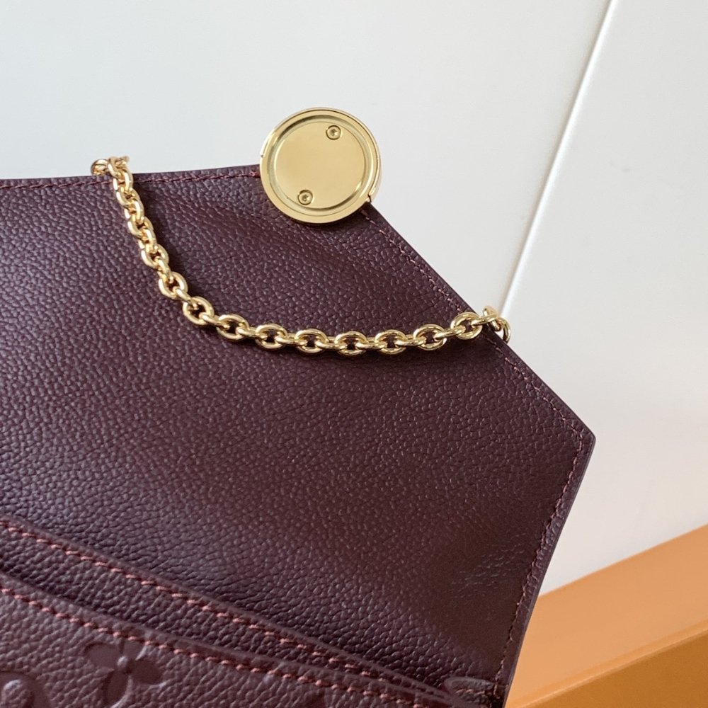This elegant Wallet On Chain Rosy offers a timeless Burgundy colorway that complements any look it is paired with. Made from the House’s signature Monogram Empreinte leather, it is accented with a gold-toned LV Circle and a sleek chain for shoulder carry. The chic design is sized to fit everyday essentials, and includes three slots to keep credit cards secure.